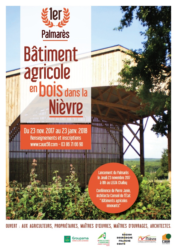 – 23/11/2017 : lancement officiel du palmarès. Pierre Janin, architecte conseil de l’État, officiant à Lyon, animera à cette occasion une conférence présentant une dizaine de ses projets agricoles bois.