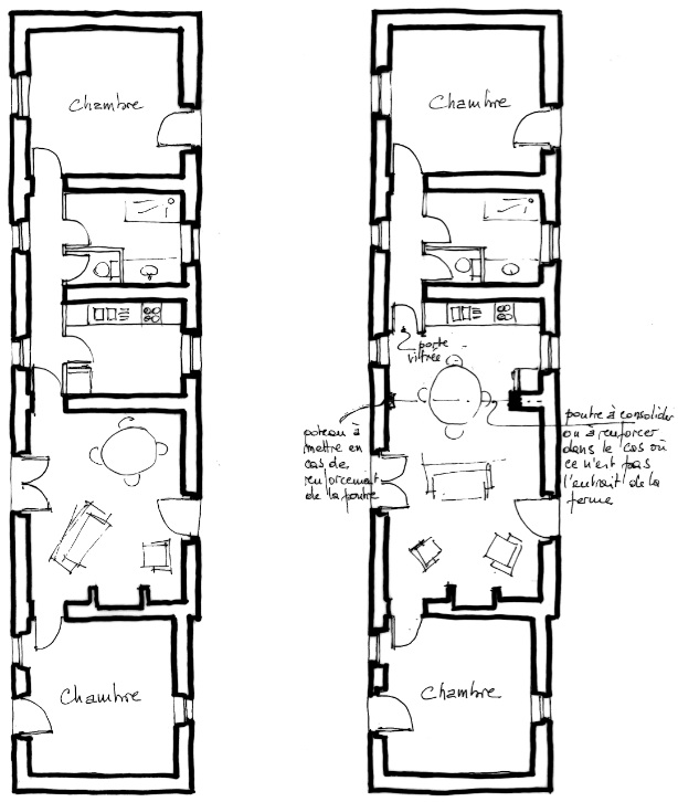 Si la partie nuit après visite ne demande aucune modification, il a été proposé de supprimer en grande partie le mur en pierre (non porteur) qui sépare le séjour de la cuisine.